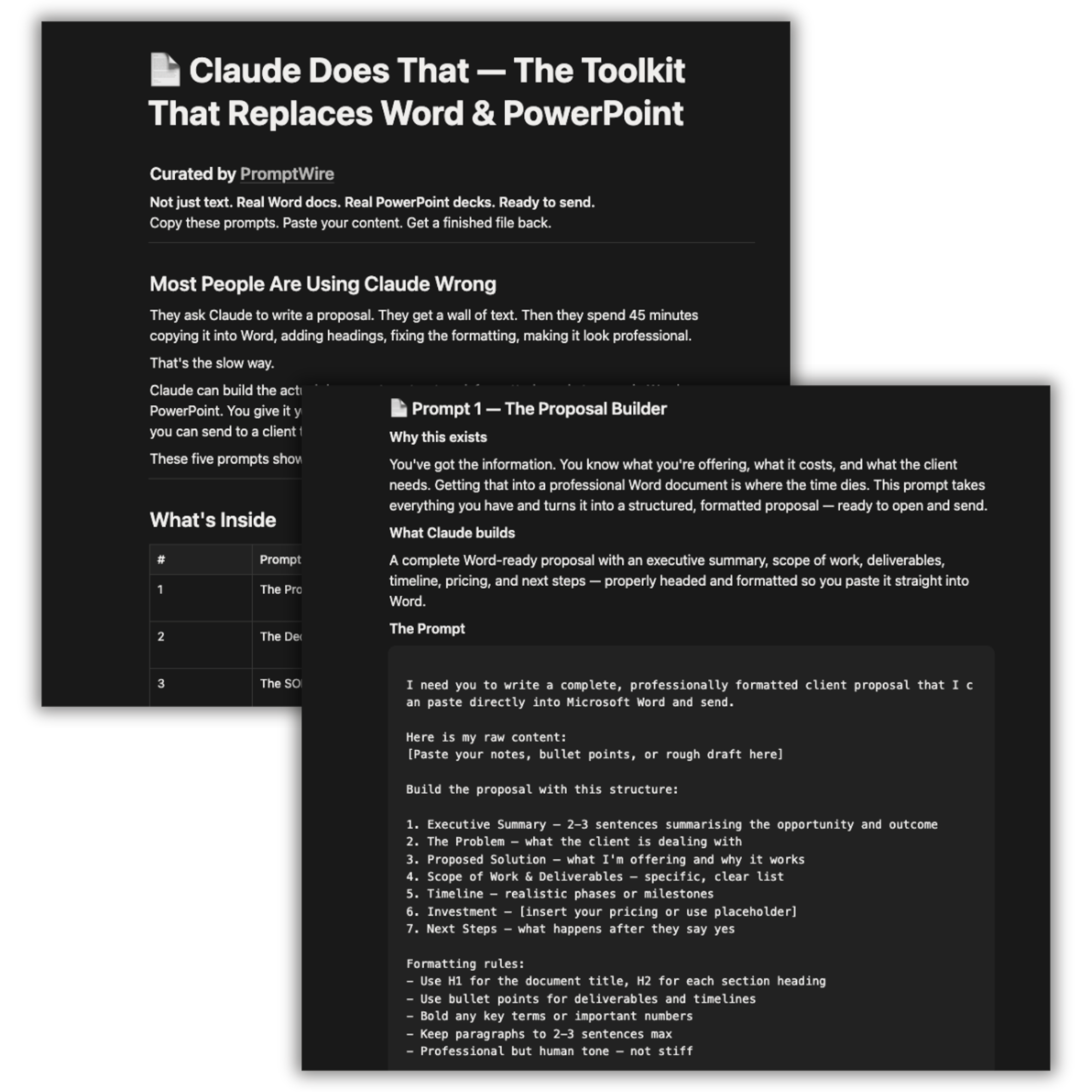 Subscribe and get instant access to 5 Claude prompts that build your actual documents — proposals, decks, SOPs, client reports, and payment terms. Give Claude your raw notes and get a finished, formatted file back. Paste straight into Word or PowerPoint and send. 🚀