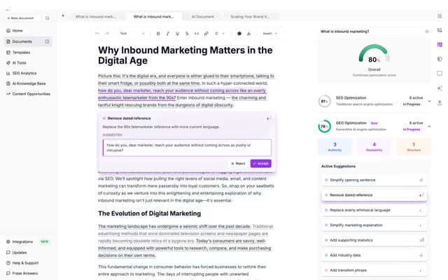 Frase bridges the gap between research, writing, and SEO. It eliminates hours spent jumping between Google, docs, and keyword tools by putting everything in one workflow. Whether you’re updating old posts or building new ones, it helps ensure that each piece meets search intent, maintains flow, and delivers measurable results.
